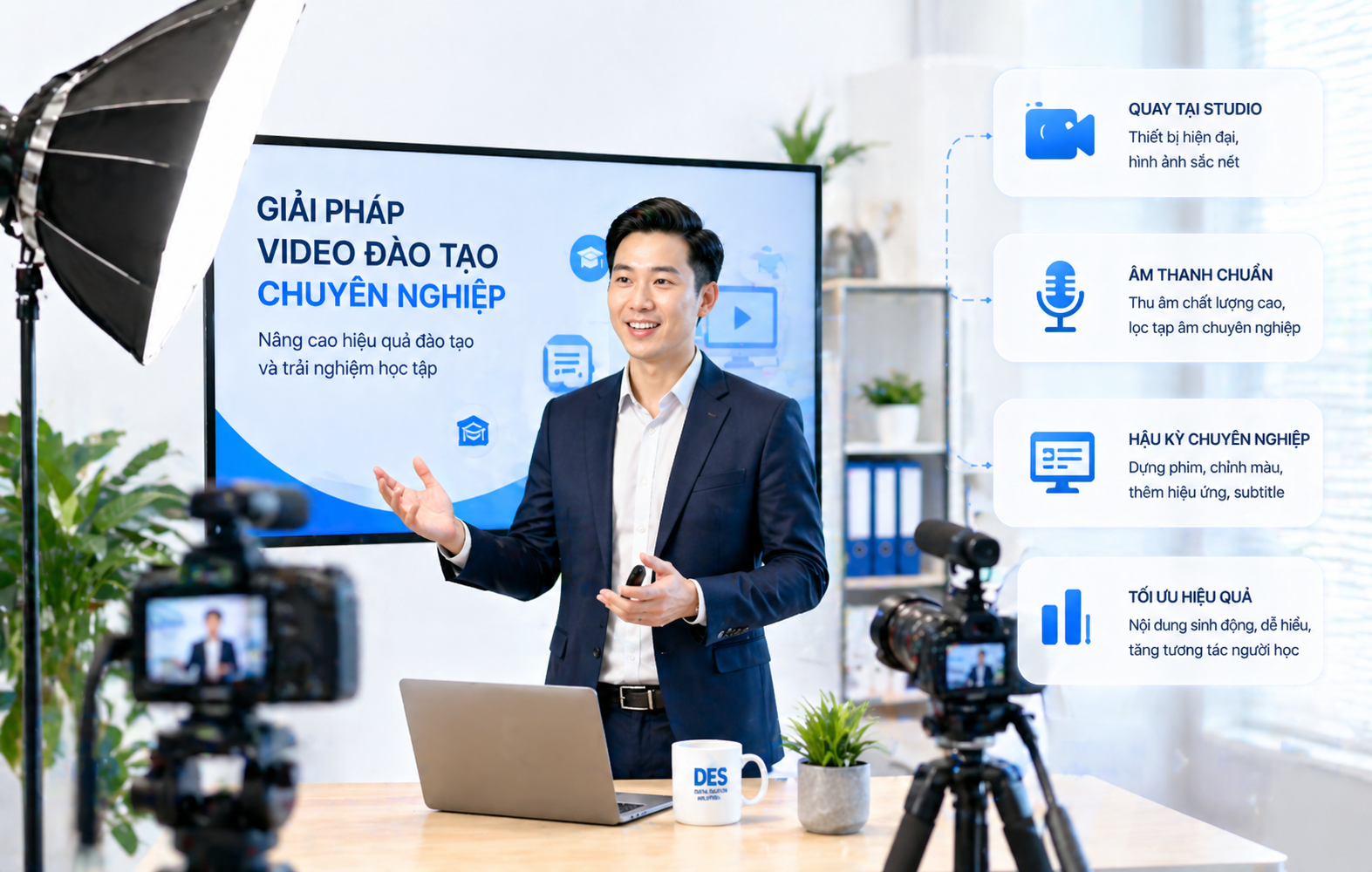 Giải pháp sản xuất video đào tạo chuyên nghiệp giúp nâng cao chất lượng nội dung, tăng trải nghiệm học tập và tối ưu hiệu quả đào tạo trực tuyến.